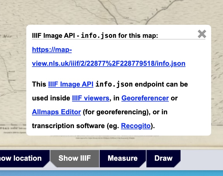 From their site, if you are looking at a single map you can click on the "Show IIIF" and grab a link to the info.json link to add it to your Manifest.